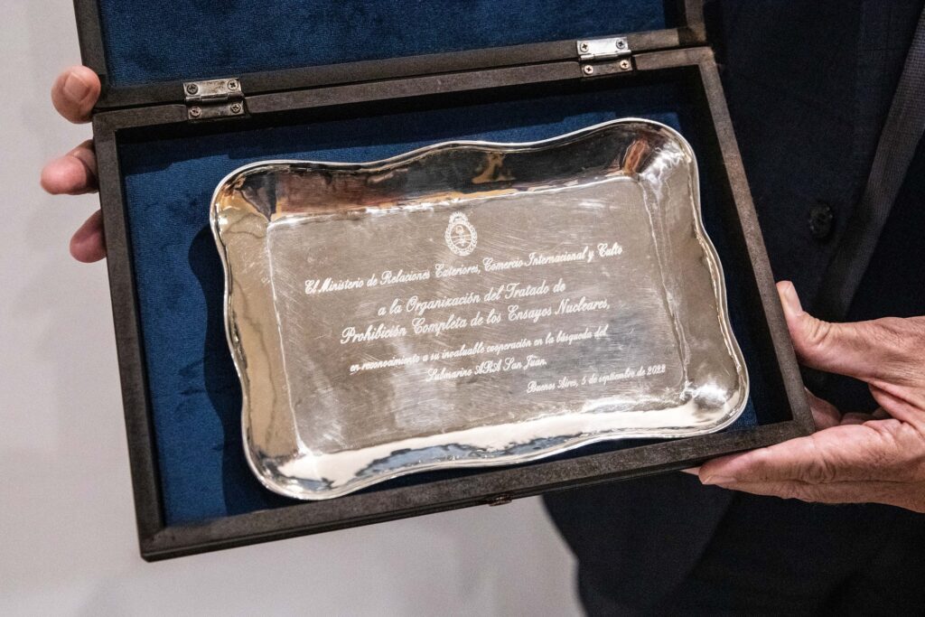 “En agradecimiento de la valiosa y profesional labor que oportunamente efectuaron los funcionarios del CTBTO, me complace entregarle a su organización en nombre de todo el Pueblo Argentino, esta placa conmemorativa con el objeto de agradecer la colaboración técnica brindada durante la búsqueda de nuestro submarino”, expresó Cafiero, al distinguir a Floyd, científico e investigador de origen australiano.