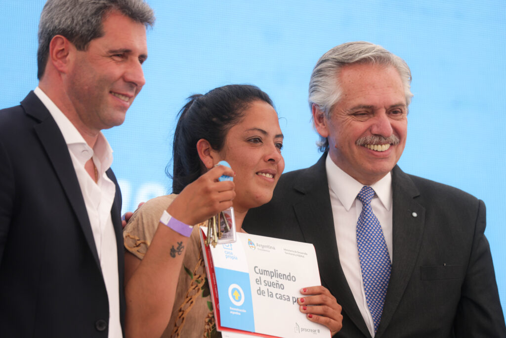 El presidente Alberto Fernández entregó este mediodía en San Juan, junto al gobernador Sergio Uñac y al ministro de Desarrollo Territorial y Hábitat Santiago Maggiotti, 837 viviendas del Programa Casa Propia en La Bebida, partido de Rivadavia, a las familias que en enero de 2021 perdieron sus casas como consecuencia de un sismo.
