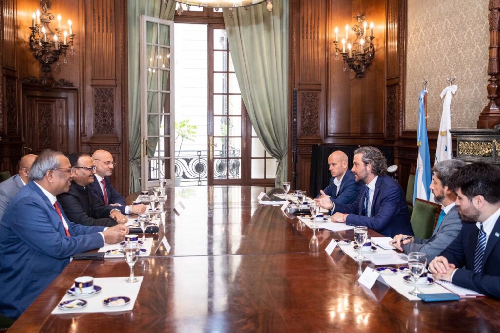 El canciller Santiago Cafiero recibió hoy en el Palacio San Martín a autoridades oficiales del Estado de Uttar Pradesh, República de la India, quienes visitan nuestro país a fin de interiorizarse sobre la oferta exportable y las posibilidades de incrementar las inversiones recíprocas y el comercio bilateral, destacando además las posibilidades de cooperación no sólo en el sector agrícola sino también en el ámbito tecnológico y en cooperación interuniversitaria, deportes y transporte urbano.