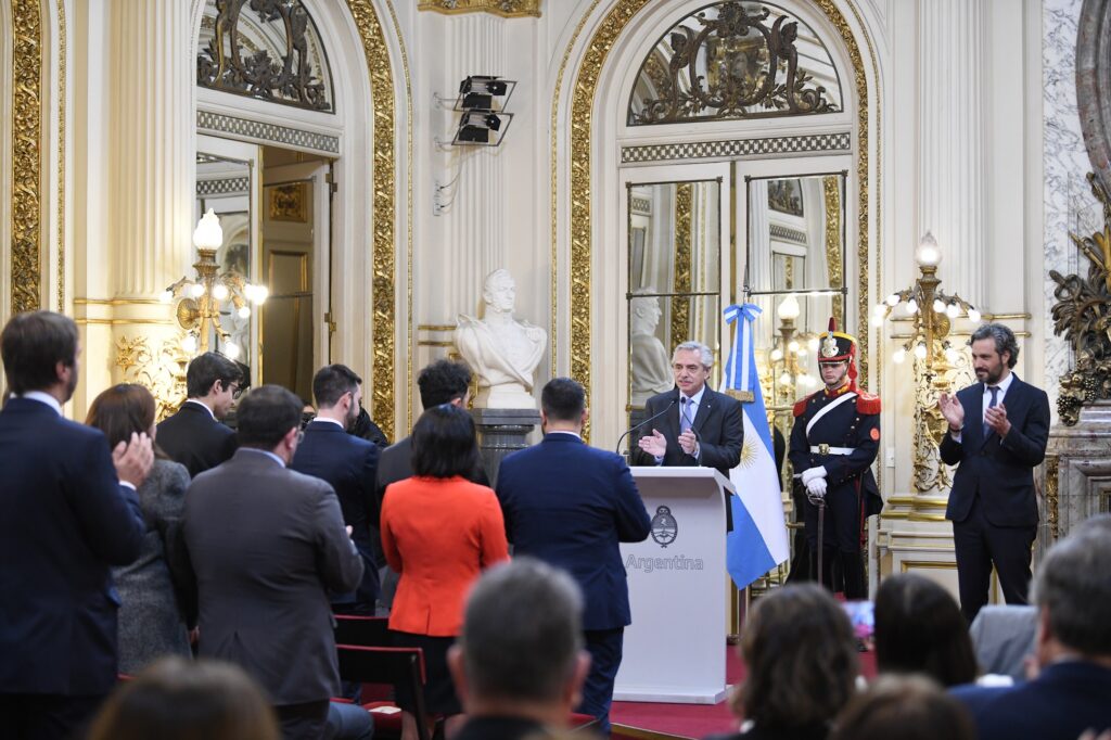 El presidente Alberto Fernández encabezó hoy, junto al ministro de Relaciones Exteriores, Comercio Internacional y Culto, Santiago Cafiero, la ceremonia de jura de fidelidad a la Nación y a la Constitución Nacional de graduados y graduadas del Instituto del Servicio Exterior (ISEN) en el Salón Blanco de Casa Rosada.
