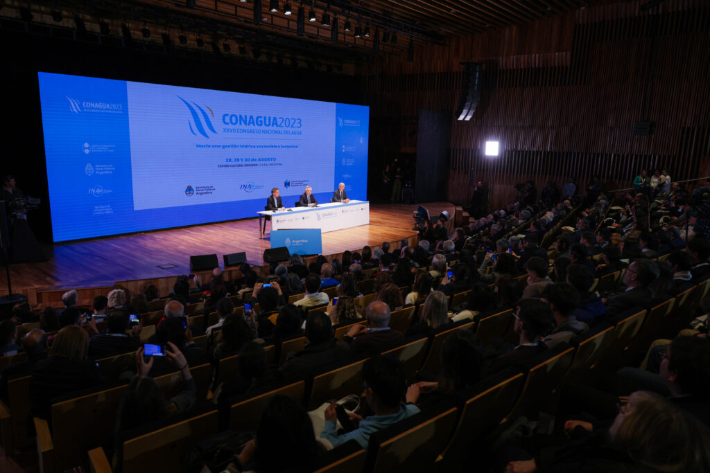 El presidente Alberto Fernández encabezó este mediodía en el Centro Cultural Kirchner, junto al ministro de Obras Públicas, Gabriel Katopodis, la apertura del XXVII Congreso Nacional del Agua (CONAGUA), el encuentro técnico-científico y de gestión del agua de mayor tradición en Argentina, que cubre todas las temáticas dentro de los recursos hídricos con una perspectiva nacional y federal.
