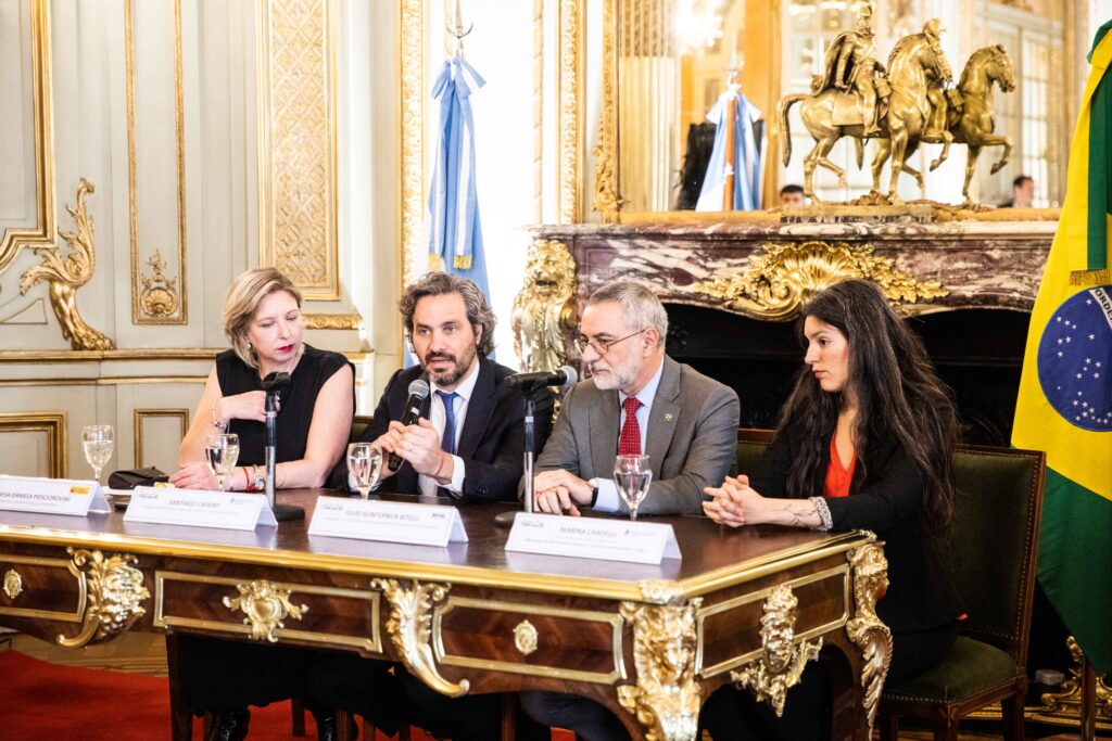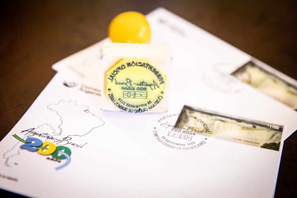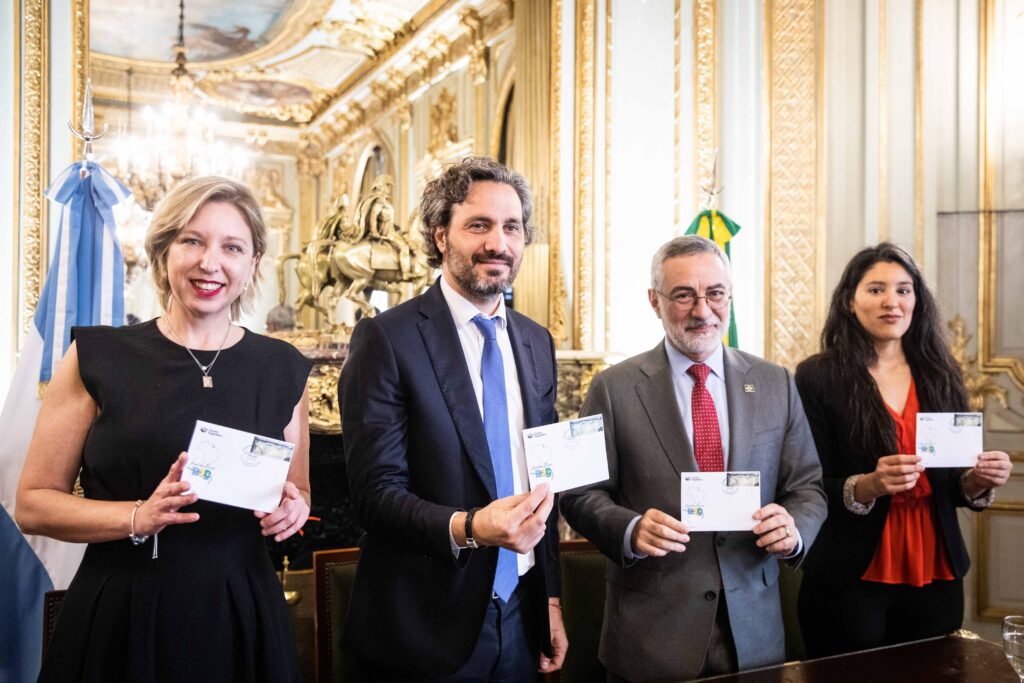 El canciller Santiago Cafiero encabezó en el Palacio San Martín el lanzamiento del sello postal que conmemora los 200 años de relaciones diplomáticas entre la Argentina y Brasil, en un acto donde estuvo acompañado por el embajador de la República Federativa del Brasil, Julio Glinternick Bitelli; la Presidenta del Correo Argentino, Vanesa Piesciorovski, y la subsecretaria de Asuntos Nacionales de la Cancillería, Marina Cardelli.