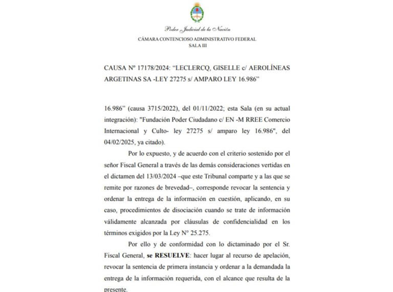 La respuesta formal de la compañía fue que la información era “secreta” y que revelarla podía perjudicar sus intereses comerciales. Con el acompañamiento y patrocinio de la clínica jurídica y gratuita de Poder Ciudadano, se llevó el asunto a la Justicia. La sentencia de primera instancia respaldó el argumento de Aerolíneas, pero en la Cámara se ordenó a la compañía a entregar los datos.